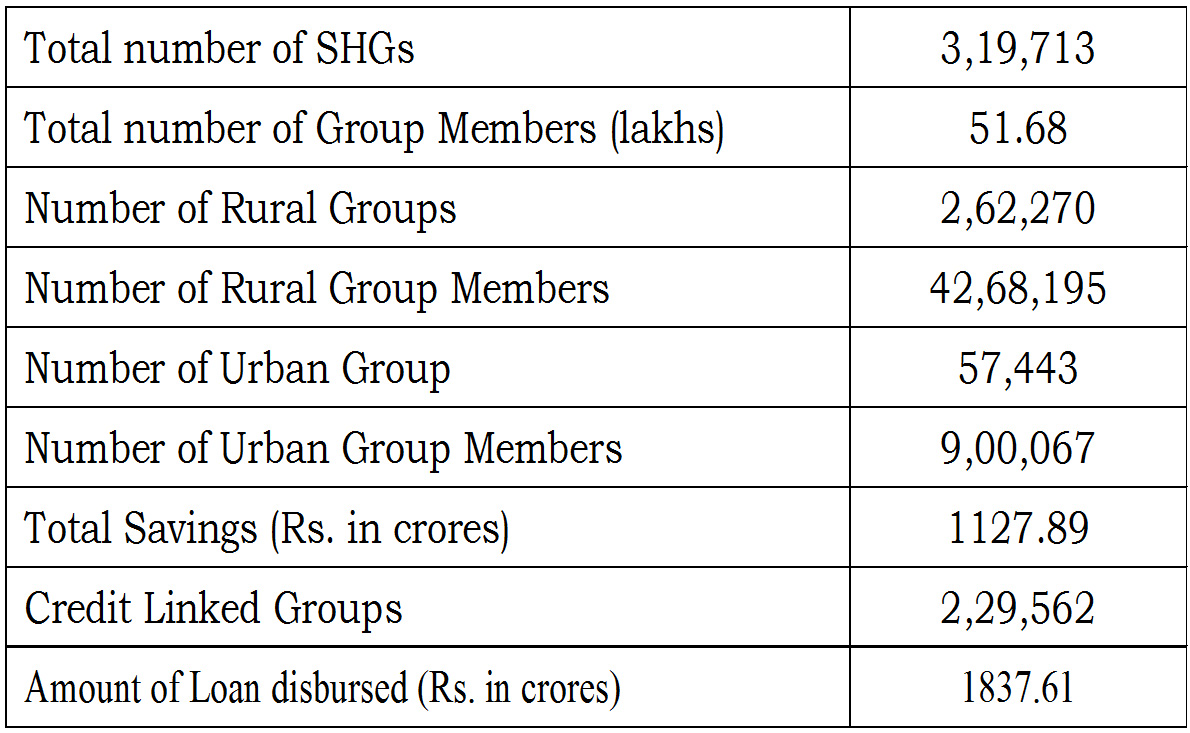 Self Help Group is a team of members (15-20 members) voluntarily formed by inclining its special purpose like savings, credit and social involvement as a tool of empowerment Tamilnadu corporation for Development of women (TNCDW) defines SHG as a small. Economically similar community group of rural poor, voluntarily formed to save and contribute to a common fund to be lend to its members as a peer group decision and for serving together for social and economic progression of their family and society. They are self-managed groups of poor women which primarily came into existence to mobilise financial resources through their own savings and lend the same amongst themselves to meet the credit needs of their members. The specific objectives of SHGs are to improve saving habits among women and increase the total family income to fulfill the economic needs through self-employment. The SHG movement has emerged as a powerful and vibrant movement spread over the length and breadth of the State. As on 30.6.2006 there were 3, 19,713 SHGs under Mahalir Thittam with a total savings of Rs.1,12789 crores in Tamil Nadu. The position of this vibrant movement is depicted below: